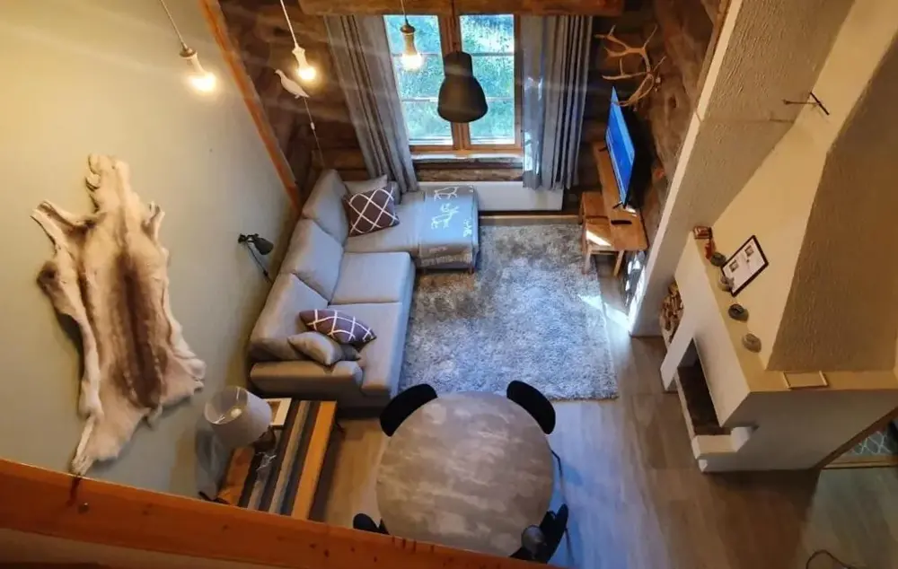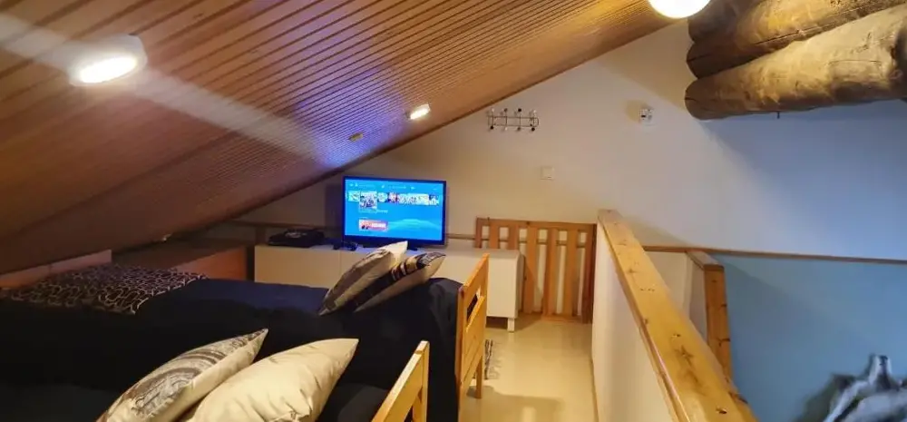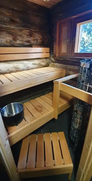 Apartment is well equipped with sauna, kitchen, living room, dining room and 5 beds. Very nice facility. A house to feel good in.